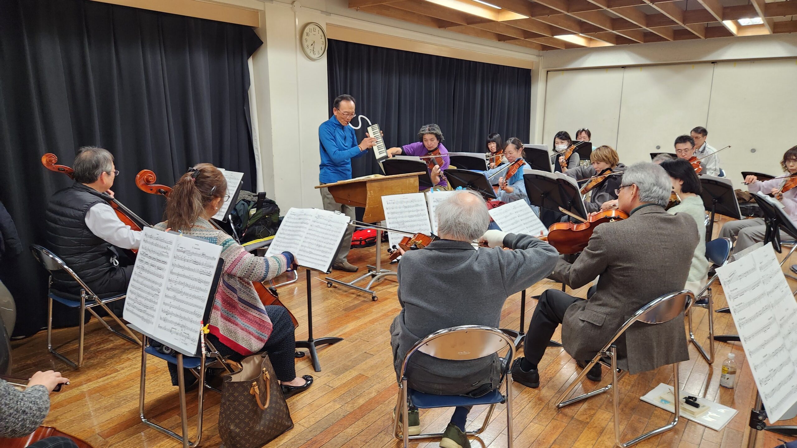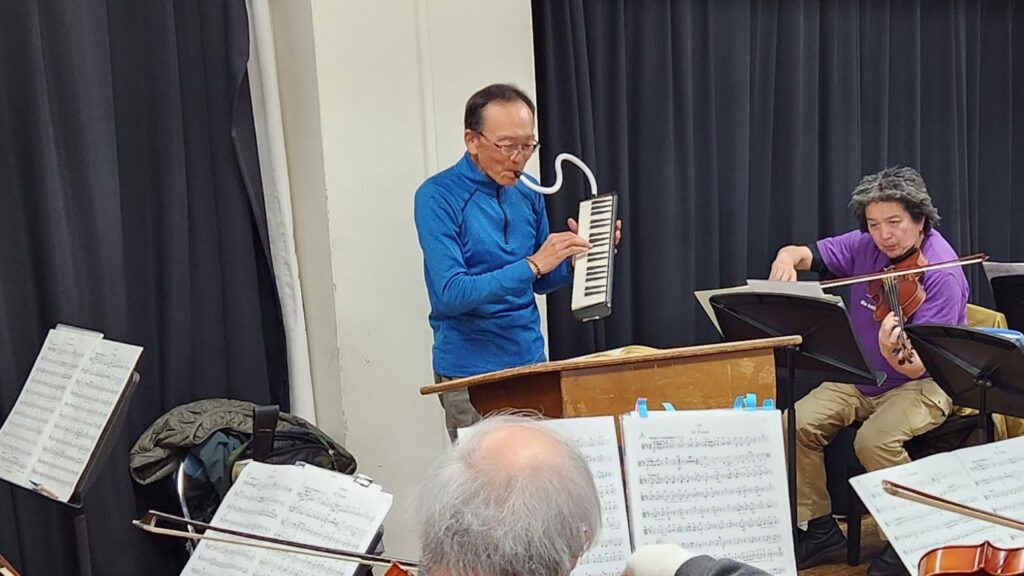 そして、今回のハイライトはなんと言ってもチャイコフスキーの「ヴァイオリン協奏曲」です!本番ではプロヴァイオリニストの平真里音さんをお迎えして演奏するこの大曲。もちろん普段の練習にソリストはいらっしゃらないのですが……なんと当団の指揮者が、タクトを振ったかと思えばサッとピアニカを構えてソロパートを吹き、また指揮に戻るという大忙しの熱演を見せてくれました! 指揮者の器用な立ち回りに、団員たちも驚きつつ大盛り上がり。ピアニカの哀愁漂う音色に合わせてオーケストラが伴奏をつけるという、当団ならではのとても楽しく、かつ熱気に満ちた合奏となりました。